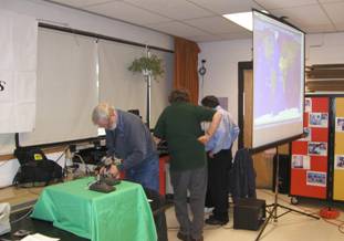 The screen on the right is set up to display SatScape, a tracking program, so everyone in the room could see where the space station was. A third laptop, the SatScape program, and an LCD projector were needed for this function.