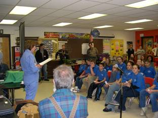 About ten minutes prior to the expected AOS Marilyn gives and introduction to the students and visitors. Behind the students are various members of the press and the School Principle.