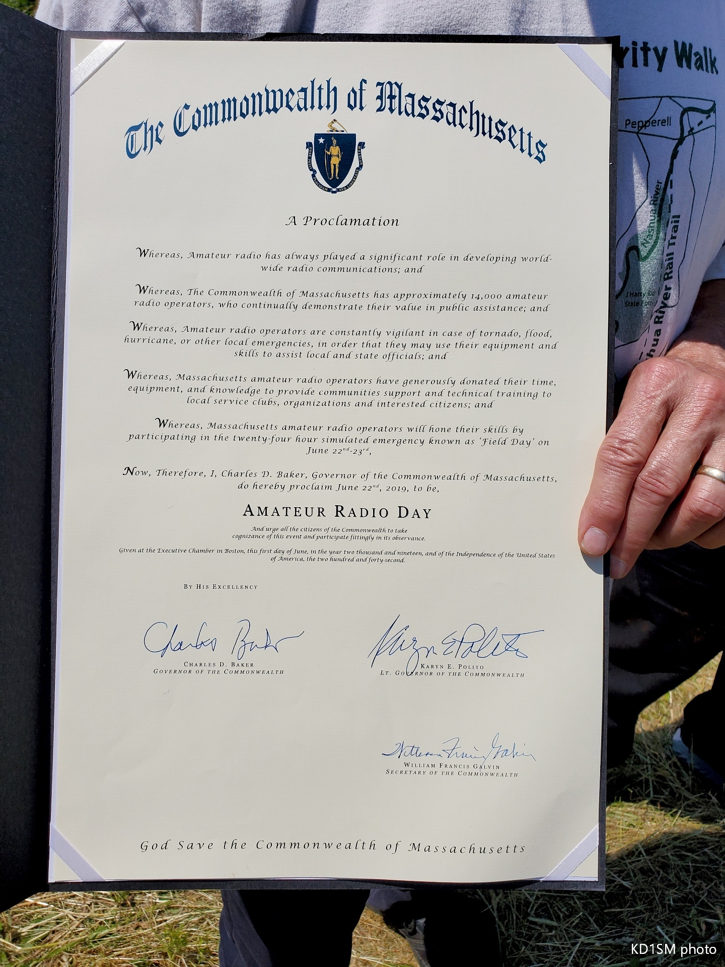 ARRL Field Day 2019 22-23 June. NVARC members ran Field Day from the Heald Street conservation area in Pepperell, MA. We ran class 2 Alpha with a third VHF station. We were pleased to welcome many visitors, including ARRL EMA Section Manager Tom Walsh K1TW who brought the proclamations from Massachusetts Governor Baker and the Commonwealth.