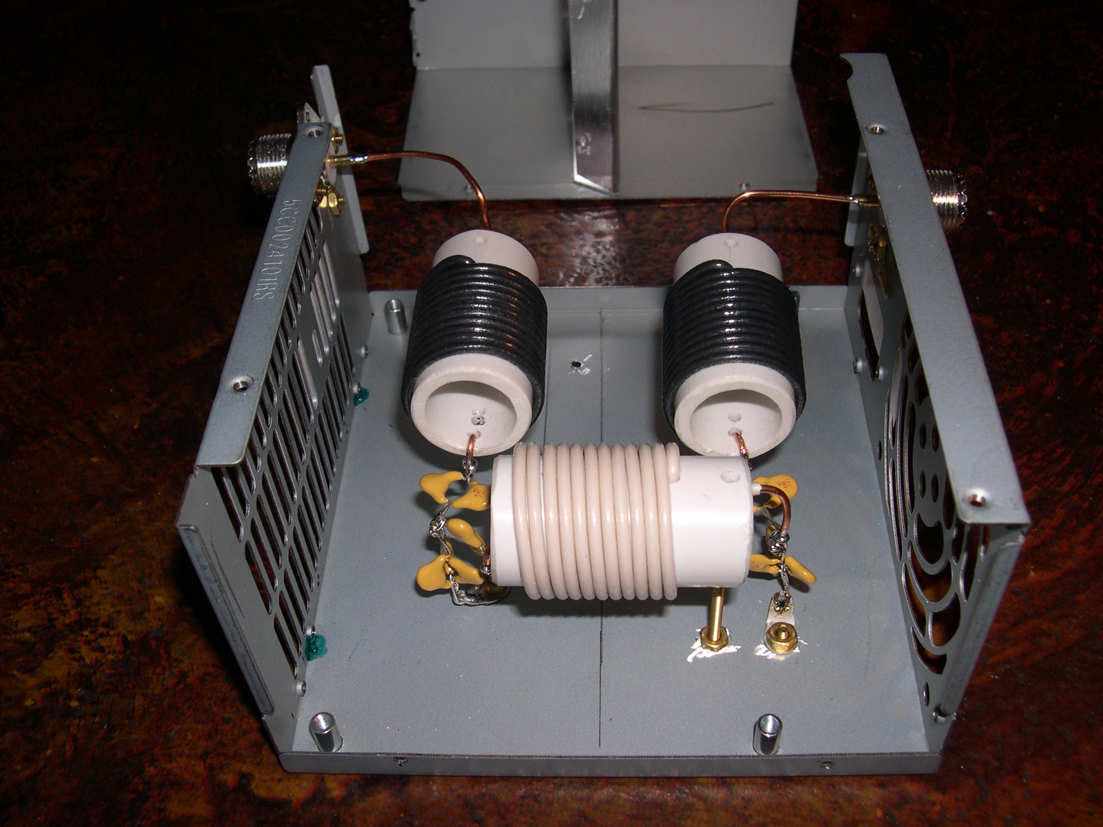 Mount the shield to two sides of the cover along the center line with four 4-40 x ¼ inch brass machine screws and nuts so that it separates the input and output coils. Drill clearance holes in the base and tap holes in the shield to secure it in place when the cover is installed.